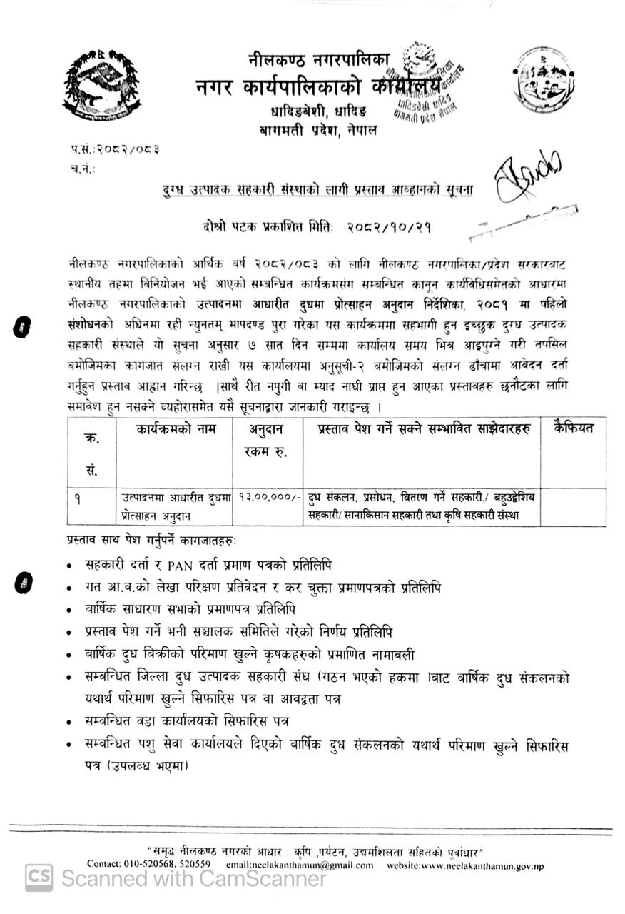 दुग्ध उत्पादक सहकारी संस्थाको लागी प्रस्ताव आव्हानको सूचना !